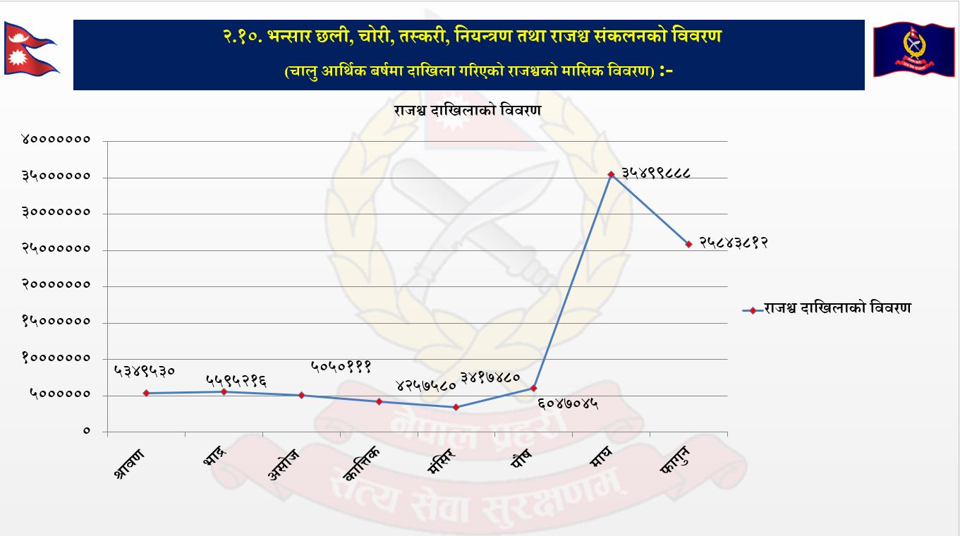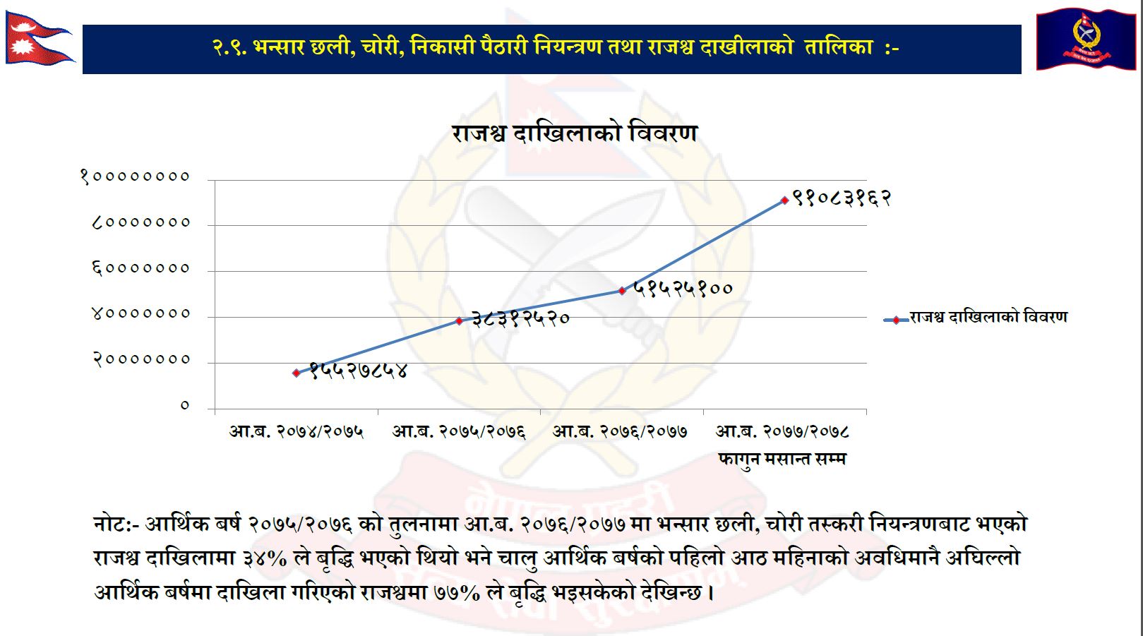आर्थिक वर्ष २०७५÷०७६को तुलनामा प्रहरीले भन्सार छली, चोरीतस्करी नियन्त्रणबाट ३४ प्रतिशत राजश्व वृद्धि गरेको थियो भने चालू आर्थिक वर्षको आठ महिनाको अवधिमै अघिल्लो आर्थिक वर्षको तुलनामा ७७ प्रतिशत बढीले राजश्व संकलन गरेको हो । प्रहरीले साउन महिनामा मात्रै ५३ लाख ४९ हजार पाँच सय ३० रुपैयाँ, भदौमा ५५ लाख ९५ हजार दुई सय १६ रुपैयाँ, असोजमा ५० लाख ५० हजार एक सय ११ रुपैयाँ, कात्तिकमा ४२ लाख ५७ हजार पाँच सय ८० रुपैयाँ, मंसीरमा ३४ लाख १७ हजार चार सय ८० रुपैयाँ र पुस महिनामा ६० लाख ४७ हजार ४५ रुपैयाँ, माघ महिनामा तीन करोड ५४ लाख ९९ हजार आठ सय ८८ रुपैयाँ र फागुन महिनामा दुई करोड ५८ लाख ४३ हजार आठ सय १२ रुपैयाँ राजश्व संकलन गरेको हो । विशेषगरी पूर्वी नाका काँकरभिट्टा, भद्रपुर, कुमरखोद, गौरीगञ्ज, सतीघट्टा लगायतका नाकामा प्रहरीले कडाइ गरेका कारण राजश्व संकलनमा वृद्धि भएको हो । कोरोना संक्रमणकाबीच पनि प्रहरीले राजश्व संकलनमा अघिल्लो आर्थिक वर्षको तुलनामा उल्लेख्य रुपमा राजश्व संकलन गर्न सफल भएको देखिन्छ ।
