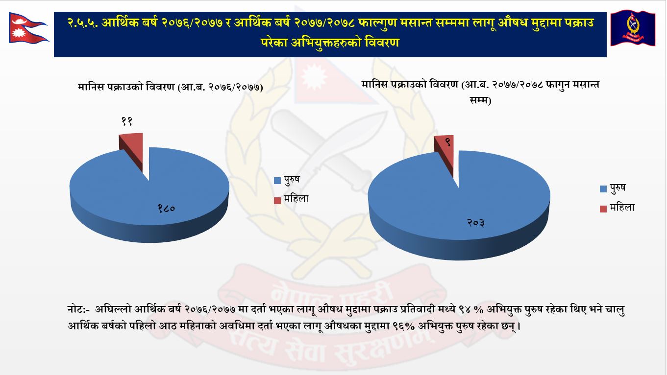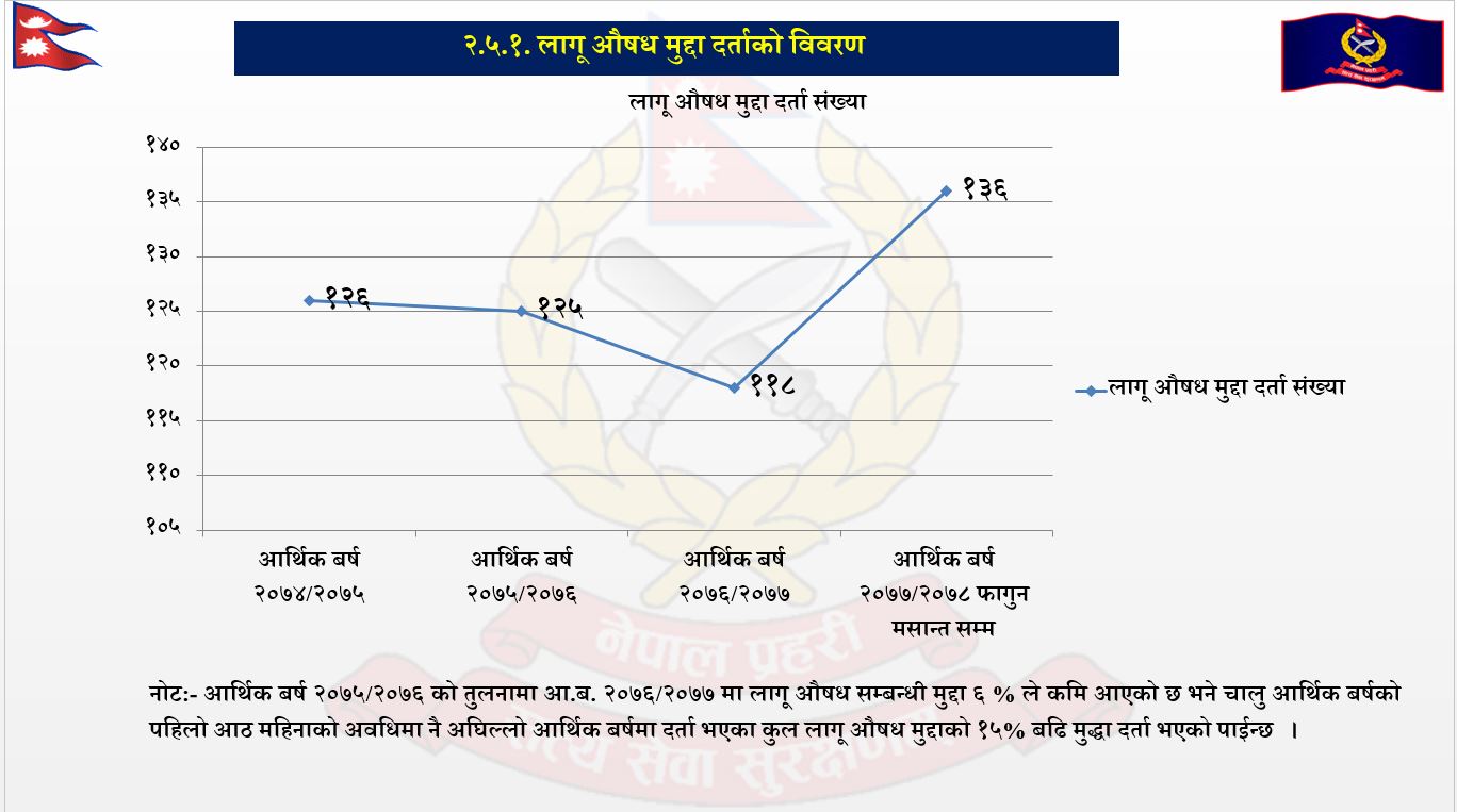 आर्थिक वर्ष २०७५÷०७६को तुलनामा २०७६÷०७७मा लागूऔषध सम्बन्धी मुद्दा ६ प्रतिशतले कम भएका थिए भने चालू आर्थिक वर्षको आठ महिनामा प्रहरीले १५ प्रतिशत बढी मुद्दा दर्ता गरेको छ । लागूऔषध नियन्त्रणमा प्रभावकारी रुपमा काम गर्दै आएको प्रहरीले दिनहुँजसो लागूऔषध प्रयोगकर्ता र ओसारपसारमा संलग्नलाई पक्राउ गर्दै मुद्दा दर्ता गर्न थालेसँगै लागूऔषध सम्बन्धी मुद्दा १५ प्रतिशत बढी दर्ता भएको जिल्ला प्रहरी कार्यालय झापाको तथ्यांकमा उल्लेख छ ।