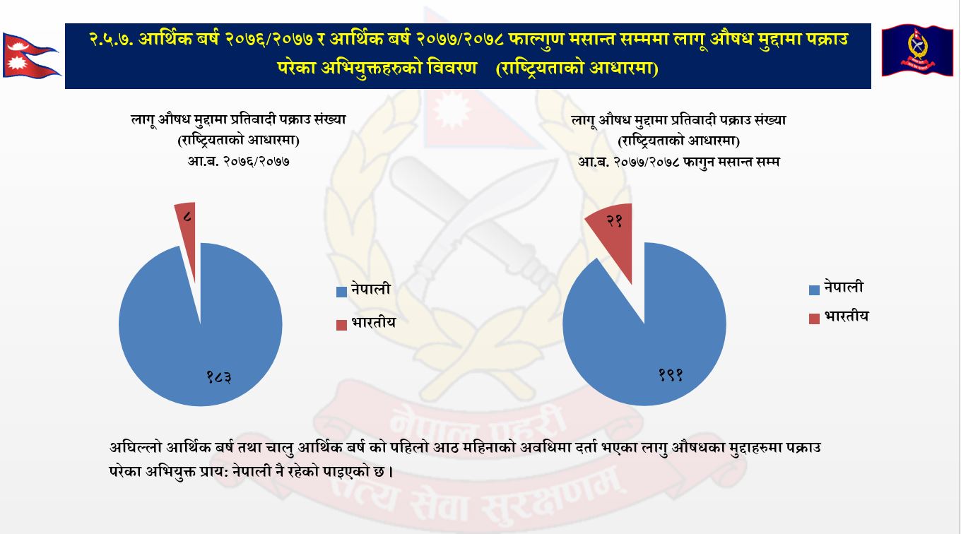 लागूऔषधसहित पक्राउ पर्ने धेरै नेपाली छन् । तीमध्ये केही भारतीय नागरिक छन् । आर्थिक वर्ष ०७७÷०७८मा २१ जना भारतीय नागरिक लागूऔषधसहित पक्राउ परेका छन् भने एक सय ९१ जना नेपाली रहेका छन् । अघिल्लो आर्थिक वर्ष २०७६÷०७७मा आठ जना भारतीय र एक सय ८३ जना नेपाली नागरिक पक्राउ परेका थिए । आर्थिक वर्ष ०७६÷०७७मा लागूऔषध मुद्दामा पक्राउ प्रतिवादीमध्ये ९४ प्रतिशत पुरुष थिए भने यो आर्थिक वर्षको आठ महिनामा ९६ प्रतिशत अभियुक्त पुरुष छन् । प्रहरीको सक्रियताका कारण विभिन्न गाउँपालिकाबाट समेत लागूऔषध प्रयोगकर्ता धमाधम पक्राउ परिरहेका छन् । पक्राउ पर्नेमध्ये गौरीगञ्ज, बुद्धशान्ति गाउँपालिकाका धेरै छन् । अघिल्लो आर्थिक वर्ष कमल गाउँपालिकाबाट ११ जना पक्राउ परेका थिए भने यो वर्ष चार वटा मुद्दा दर्ता छन् । गौरीगञ्ज गाउँपालिकामा अघिल्लो आर्थिक वर्ष एउटा मुद्दा दर्ता थियो भने यो वर्ष आठ वटा मुद्दा दर्ता छन् । बाह्रदशी गाउँपालिकाबाट अघिल्लो आर्थिक वर्ष एउटा मुद्दा दर्ता थियो भने यो वर्ष चार वटा मुद्दा दर्ता छन् ।