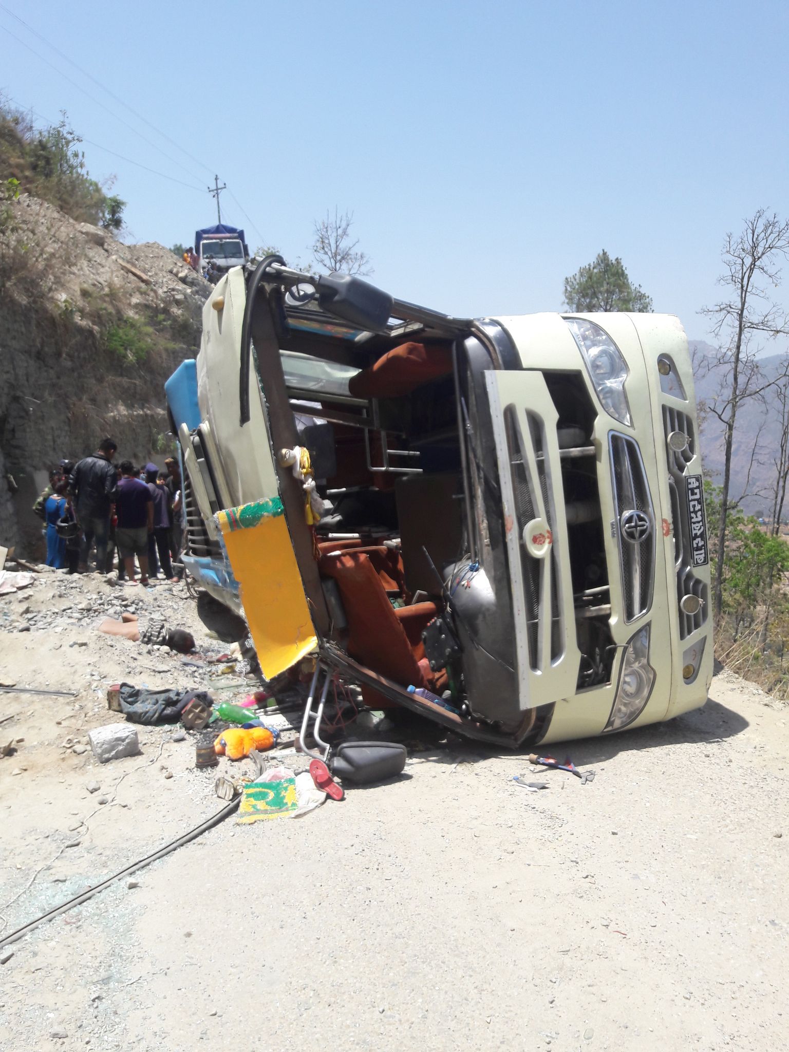 दुर्घटनामा २२ जना घाईते र १६ जना सामान्य घाईते भएका छन् । बा ३ ख ९२८५ नम्बरको बस आफै अनियन्त्रित भई सडकबाट अन्दाजी १५ मिटर तल्लो सडकमा खसेर दुर्घटना हुँदा सो बसका सह–चालक सिन्धुली घ्याङलेक गाँऊपालिका १ का २५ बर्षीय अनिल तामाङको घटनास्थलमानै मृत्यु भएको छ ।