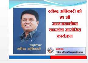 तत्कालीन संस्कृति, पर्यटन तथा नागरिक उड्डयनमन्त्री रवीन्द्रप्रसाद अधिकारी विकासका संवाहक साथै एक दूरदर्शी नेताका रुपमा रहेको विभिन्न क्षेत्रका वक्ताले चर्चा गरेका छन् । अधिकारीको ५२ औंँ जन्मजयन्तीका सन्दर्भमा रवीन्द्र अधिकारी स्मृति प्रष्ठिानद्वारा आयोजित ‘विकास, समृद्धि, राजनीति र रवीन्द्र अधिकारी’ विषयक भर्चुअल विचार गोष्ठीका वक्ताले अधिकारी विकासको स्पष्ट धारणा बोकेर गन्तव्यमा लम्केको नेताका रुपमा चित्रण गरे ।